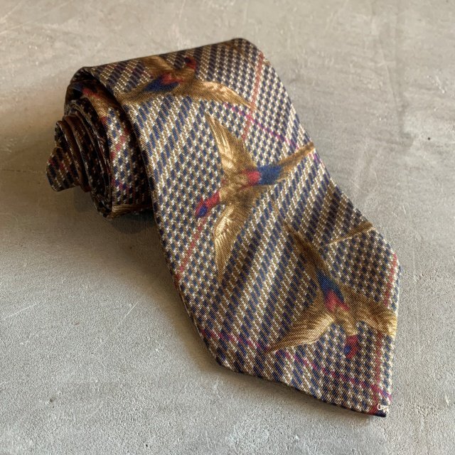 - 【幅 9.8㎝】USA製 Eddie Bauer 鳥 シルクネクタイ 総柄 茶系■ビンテージ オールド レトロ アメリカ古着 80s-90s エディーバウアー