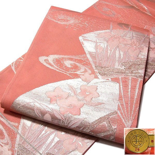 > [和楽屋] 訳あり■「夏物 絽」煌びやかな 扇子 桔梗 杜若 京都西陣織「老舗 西陣まいづる謹製」単衣や夏着物に 夏帯 最高級 正絹 袋帯■