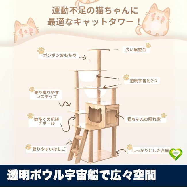 > 【透明ボウル宇宙船で広々空間】キャットタワー 木製 据え置き 大型猫 宇宙船 透明ボウル 見晴台 爪とぎ 高級感 安定 人気 おすすめ