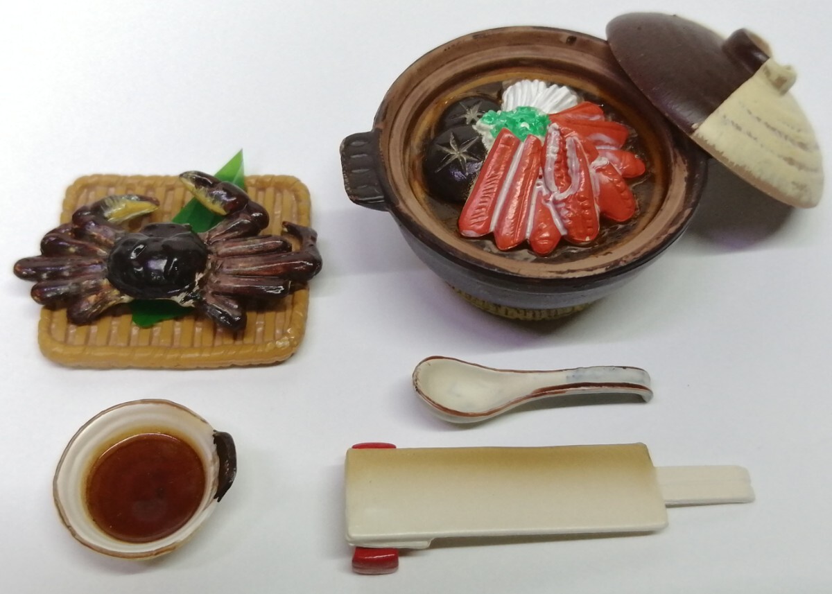 - 蟹鍋 ぷちサンプルシリーズ 和食三昧 鍋敷き 蟹 つけダレ レンゲ 箸 箸置き ミニチュア フィギュア リーメント