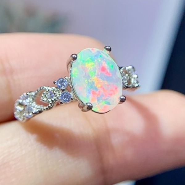 ナチュラルオパールリング、7x9mm、925シルバー、ファッションジュエリー