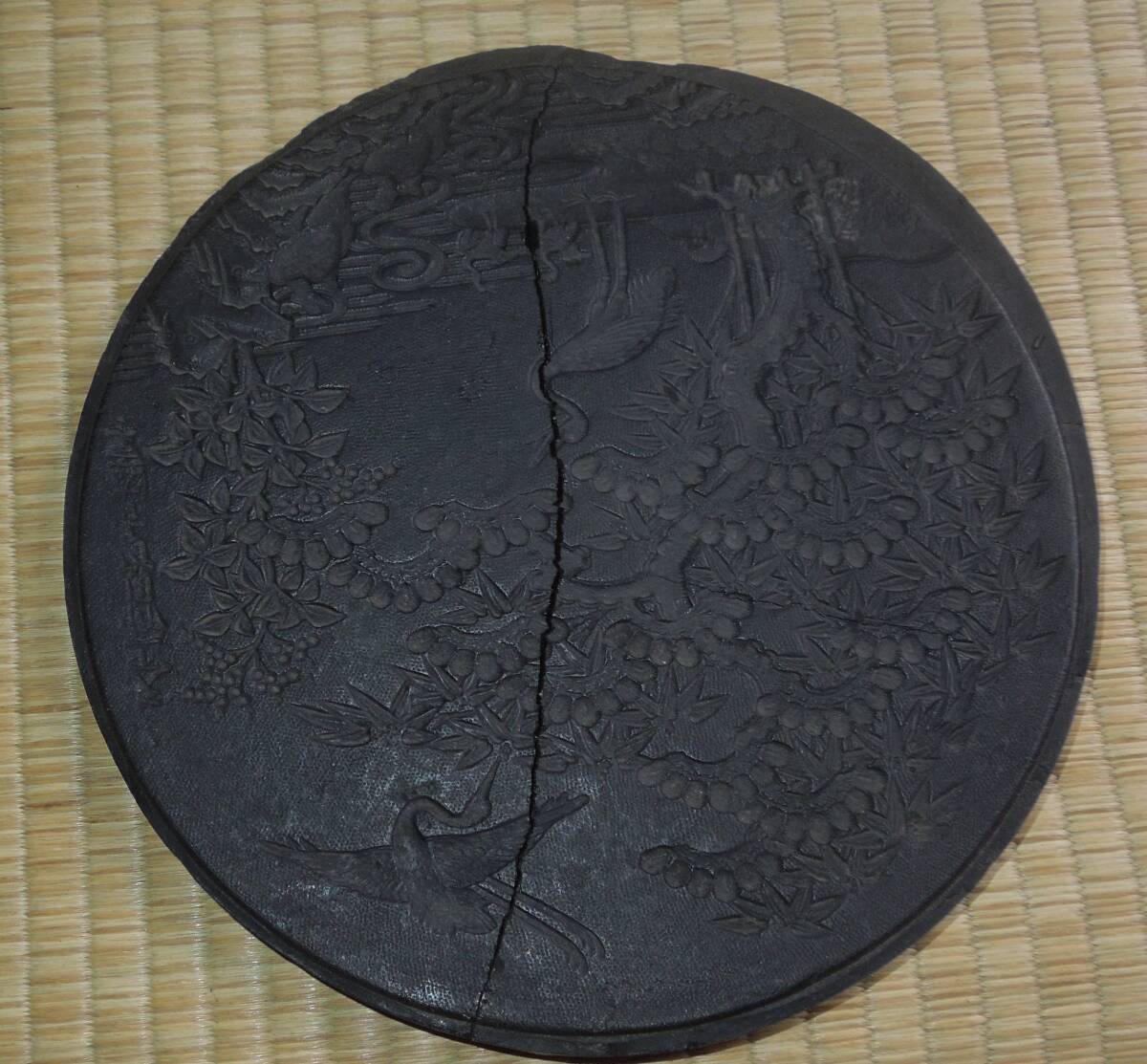 - 書道 墨 古墨 江戸墨 古鏡型 鶴 約738g