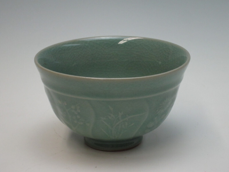 - 高麗青磁 沙音窯 作 陽刻四君子文抹茶茶碗