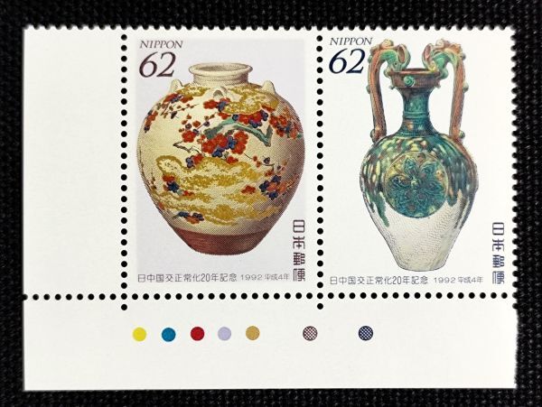 - [25060346]【日中国交正常化20年記念】2種連刷 CM・カラーマーク付「色絵梅月文茶壺 唐三彩龍耳瓶」62円×2 1992年発行 美品