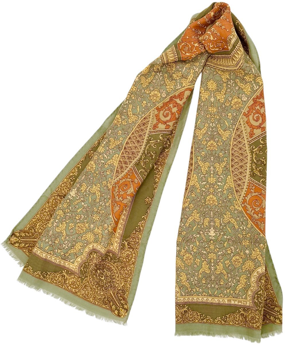 - イタリア製 ETRO エトロ ペイズリー 総柄 シルク混 ウール 小判 ストール ロング スカーフ 端フリンジ 薄手 130×42cm カーキ 男女兼用