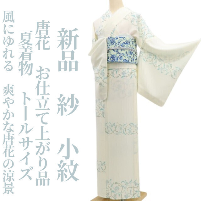 > tomihisa 新品 紗 唐花 お仕立て上がり品 夏着物 正絹 仕付け糸付“風にゆれる、爽やかな唐花の涼景”トールサイズ 小紋 5940