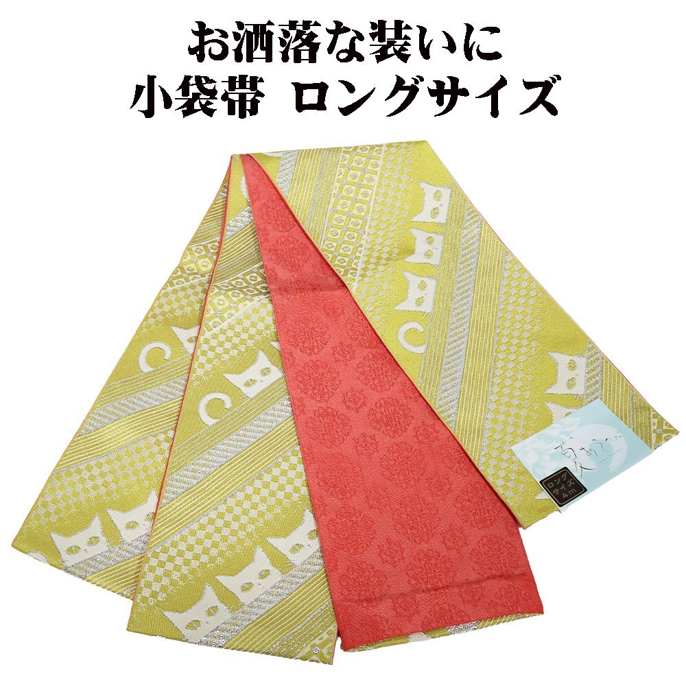> 小袋帯 高級化繊 黄土色 猫 赤 華文 ロングサイズ LY3111 新品 日本製 半幅帯 長尺 リバーシブル 浴衣 小紋 オールシーズン 送料込み