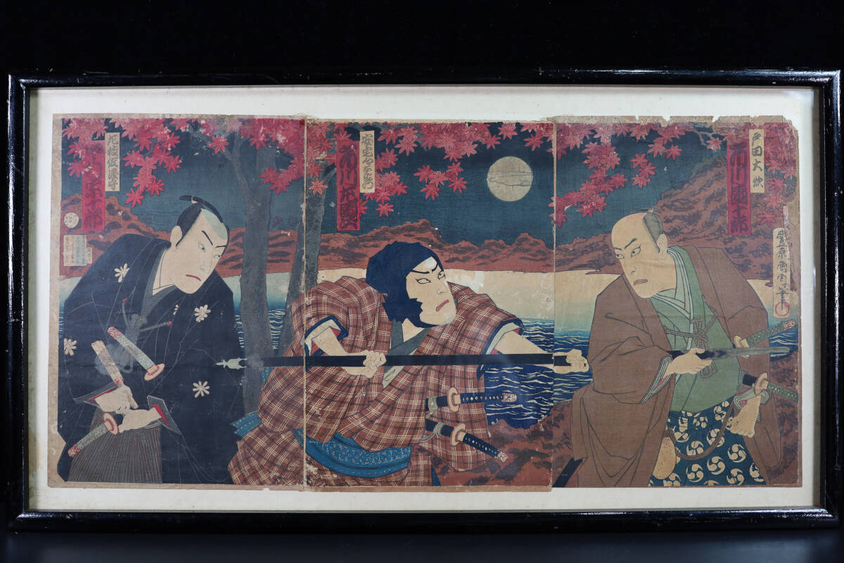 - ◇雅◇ 真作保証 豊原国周 「鏡山錦葉」 時代物 木版画 浮世絵 錦絵 役者絵 大判 3枚続 額装 /IK.25.5 [J54] P