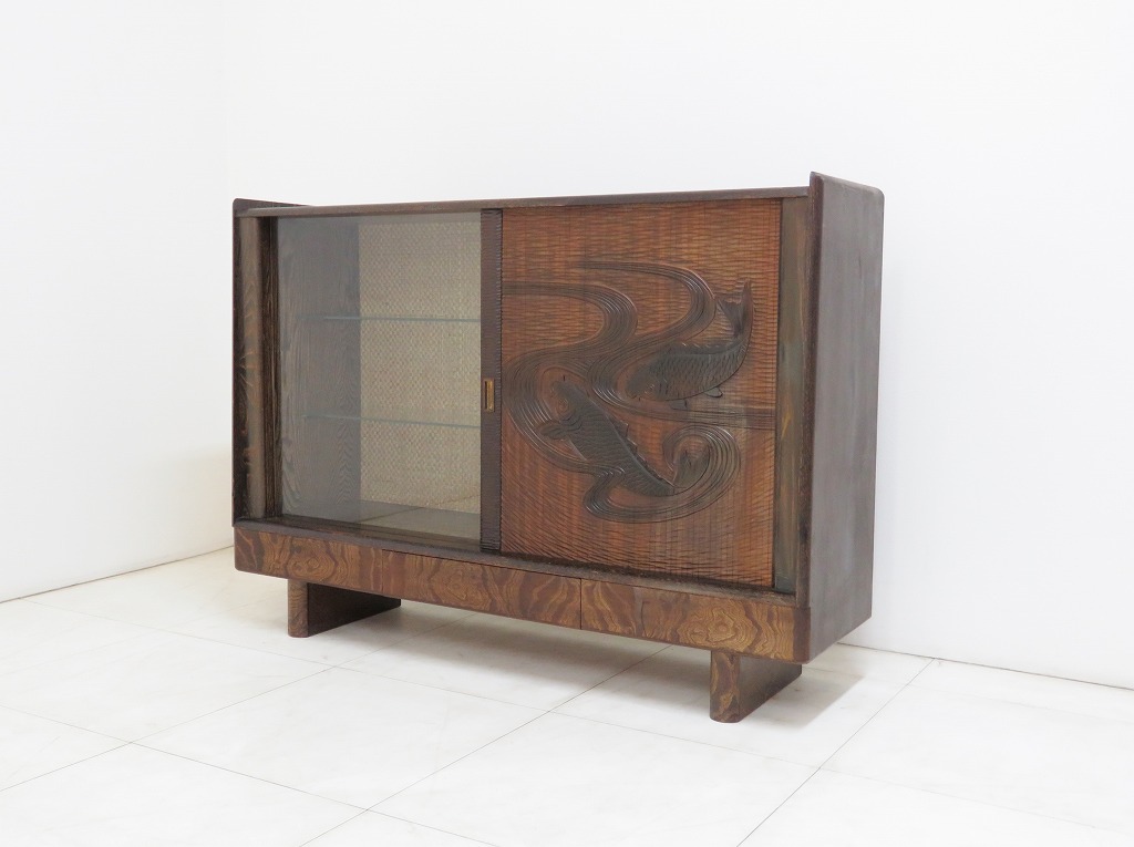 - 古い蛇腹扉の棚 日本製 ヴィンテージ 古家具 サイドボード 飾り棚 キャビネット レリーフ