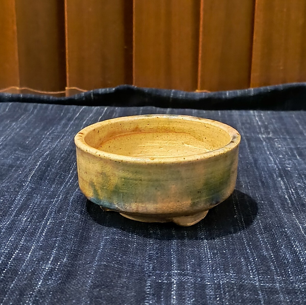 - 美濃 瀬戸 ビードロ釉 灰釉 タンパン 三足 香炉 検) 染分け 古民芸 古道具 骨董 民芸 古瀬戸 緑釉 御深井