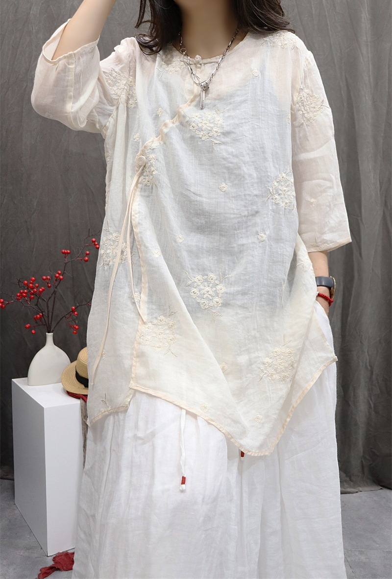 - 「同梱1万円送料無料」レディースチュニック トップス 刺繍七分袖大人かわいい 30代 40代 50代ゆったり体系カバー不規則~白