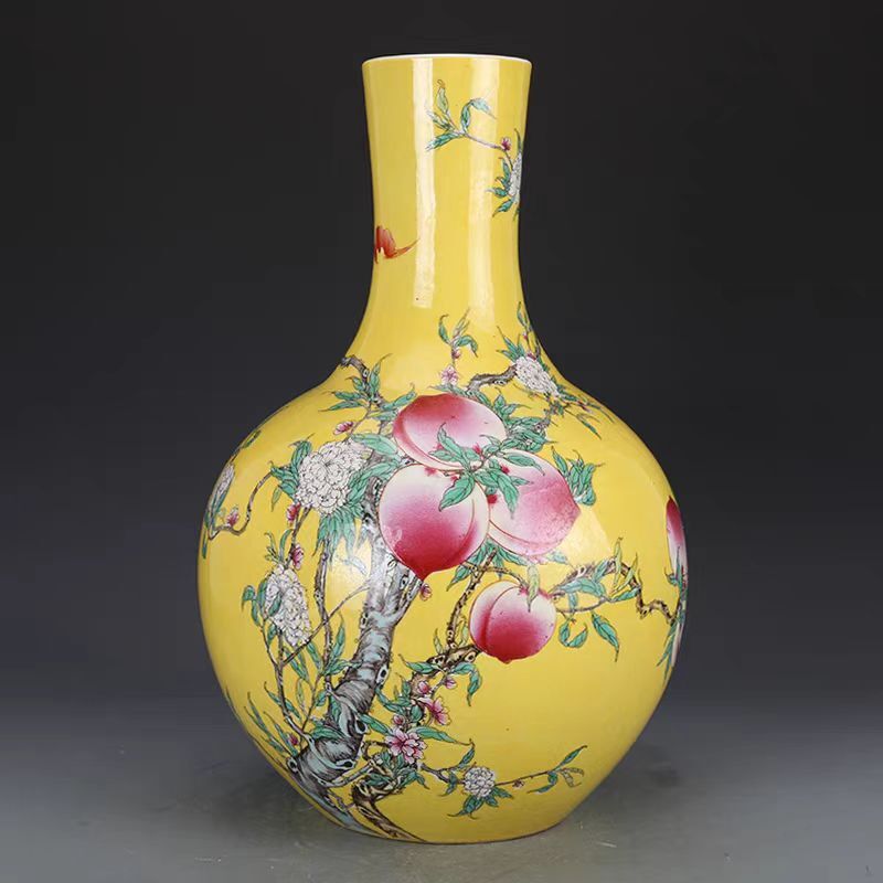 - 清時代 雍正年製款 古陶磁器 黄地 粉彩 九桃紋 天球瓶 賞瓶 磁器 文案置物 擺件 時代物 古董品 骨董 旧家蔵出 唐物 中国古玩 古美術品