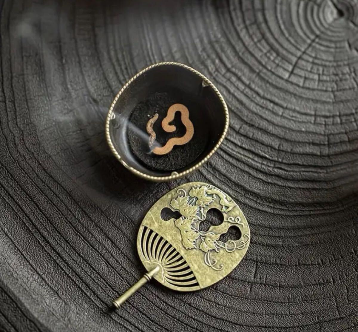 - 【香炉】うちわ型 金属 重厚感 お香立て アジアン エスニック 細部作り込み 高品質 お香受け 皿 アロマ お香 線香 コーン