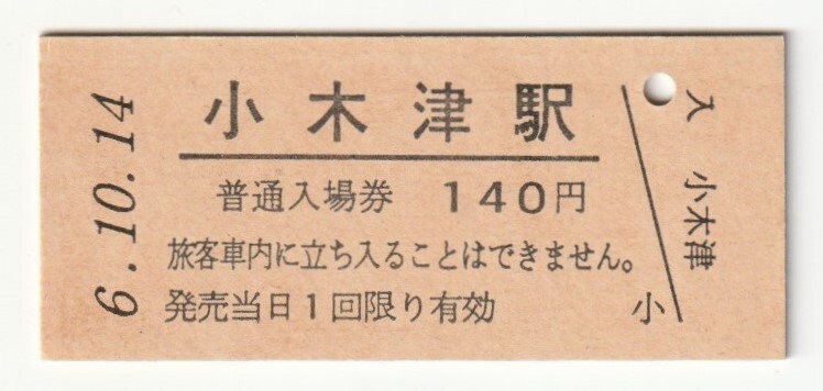 - 平成6年10月14日 常磐線 小木津駅 140円硬券普通入場券(日付印刷)