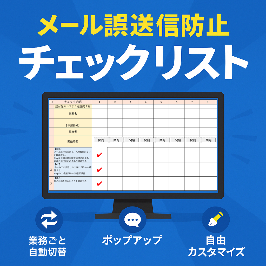 > 【業務別対応/誤送信防止】カスタム可能!超高機能メールチェックシート Excel VBAツール業務名ごとに自動切替/ポップアップ対応