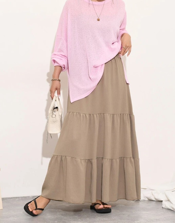 - 匿/ゆうパケット送込【未使用】ティアードスカート ロング フレアースカート モカ