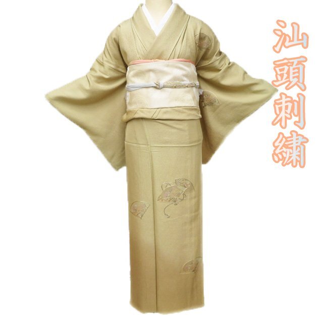 > 付下げ 付け下げ 訪問着 着物 中古 単衣 汕頭刺繍 扇子に花の図 暈し 麦藁色 多色 身丈160cm 裄64.5cm M きもの北條 A1212-18