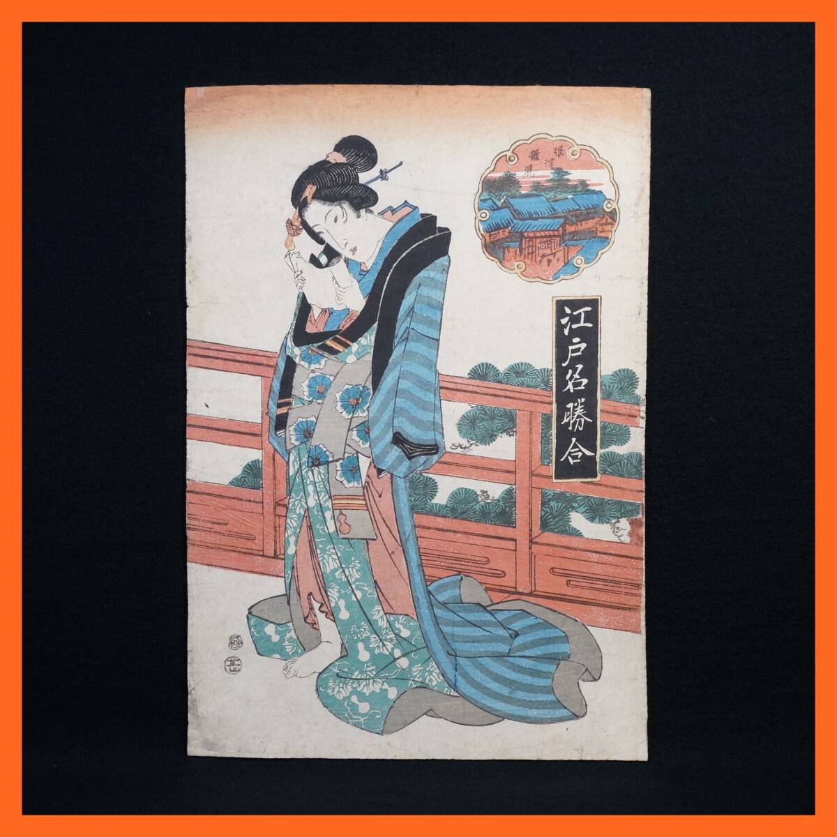 - 東ハ:【浮世絵版画】江戸 名勝合 名所絵 浮世絵美人画 大判竪絵 縦約37.5×横約25.6㎝ 木版 時代物 ★送料無料★