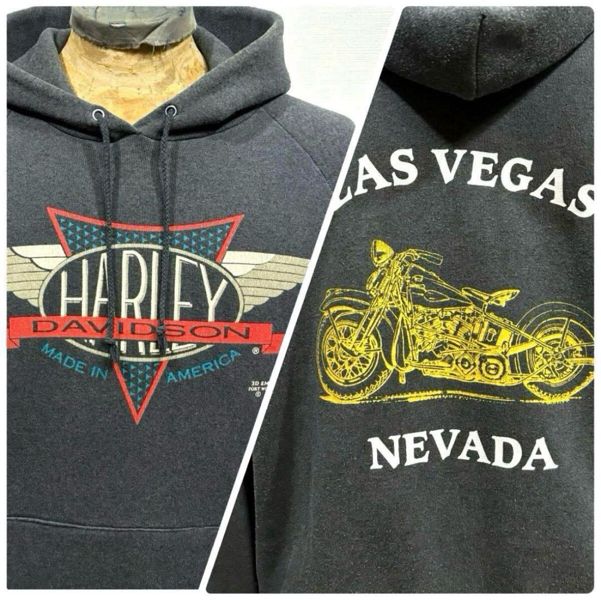 > L 両面 90s 3Dエンブレム ハーレーダビッドソン パーカー ビンテージ フーディ オールド アメリカ 古着 バイク バイカー ライダース 80s