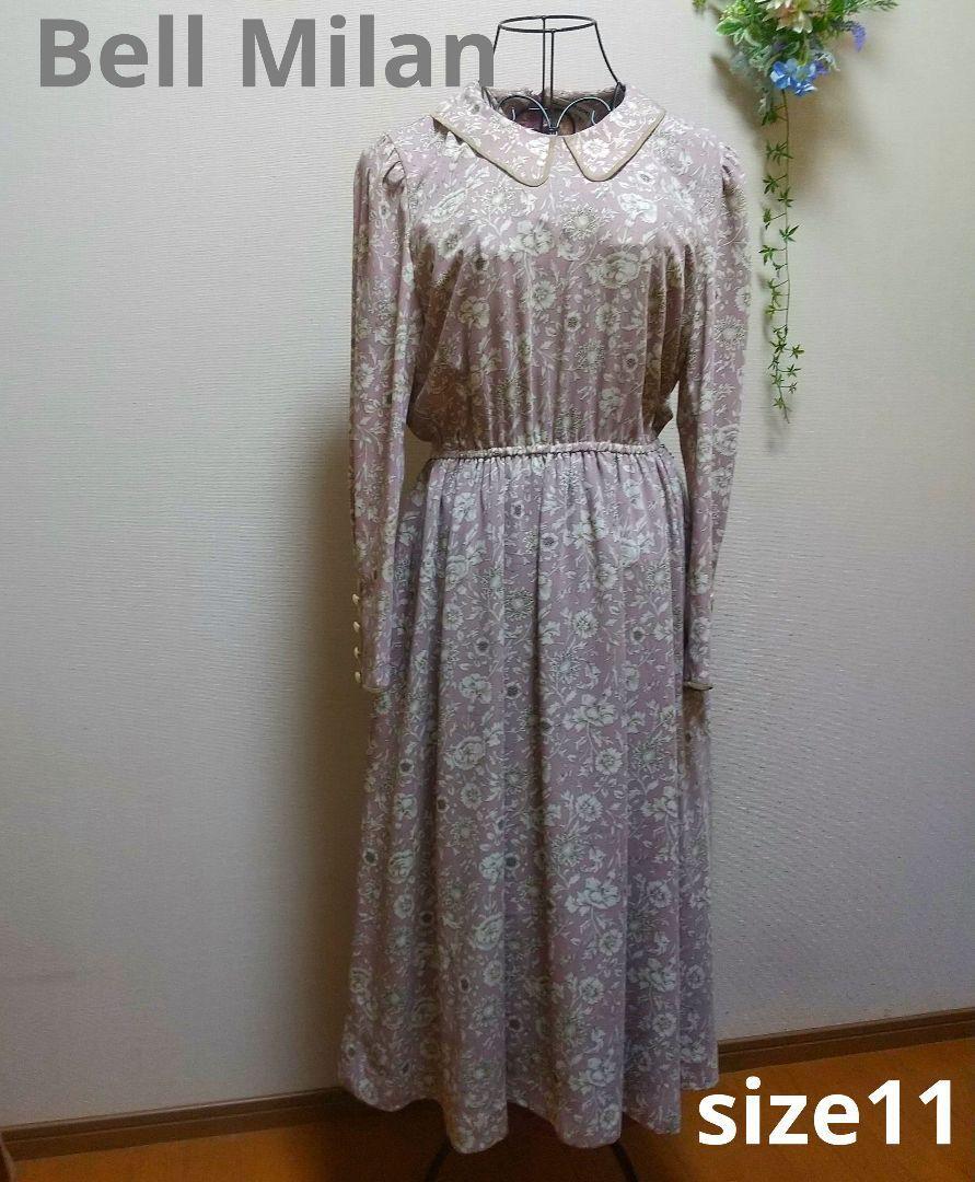- ♪薄紫×白 花柄 長袖 ロングワンピース クラシカルファッション レトロ 襟付き 0014
