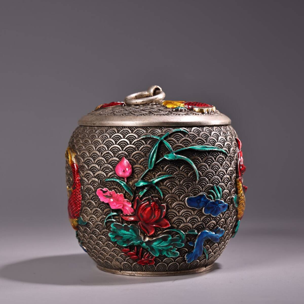 - 【超珍館蔵】銅製 銀鍍 景泰藍 琺瑯彩 年年有餘紋罐 置物 賞物 古賞物 古董品 古美術品 時代物 旧家蔵出 稀少珍蔵品