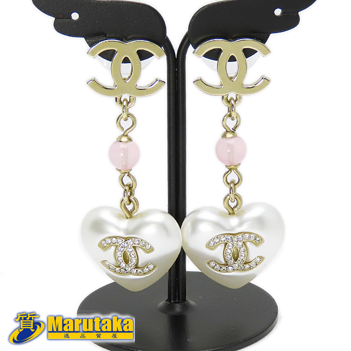 - 【シャネル】ピアス ハート 揺れる フェイクパール ラインストーン ゴールド ココマーク A21B ぶら下がり 中古 CHANEL 24k120-2