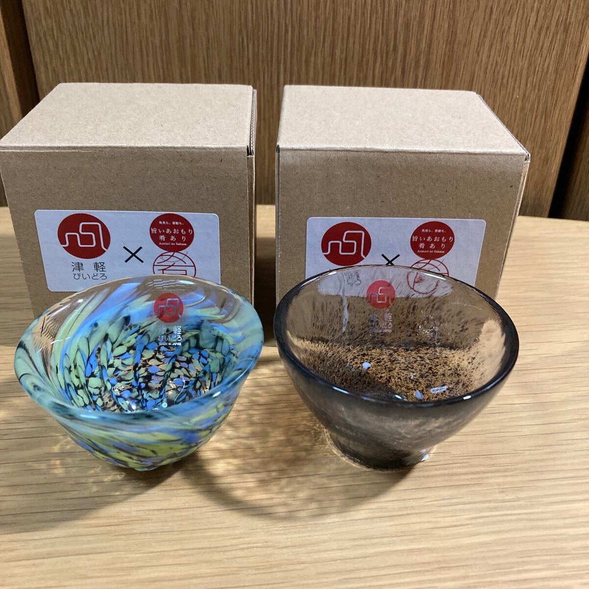 - ▼津軽びいどろ≪ぐい呑み 2個≫旨いあおもり肴あり 鮃 鯖 盃 お猪口 石塚硝子