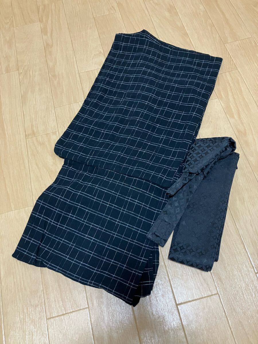 - USED★メンズ浴衣セット★チェック柄ネイビー×帯ブラック/ワンタッチ帯