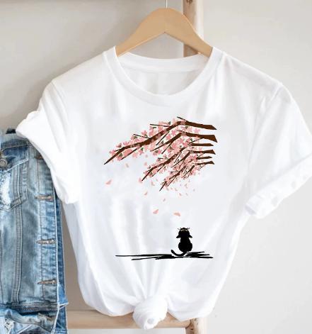 - Tシャツ レディース 半袖 猫柄 綿100% 猫 小判 ネコ ねこ トップス 花見猫 (L)