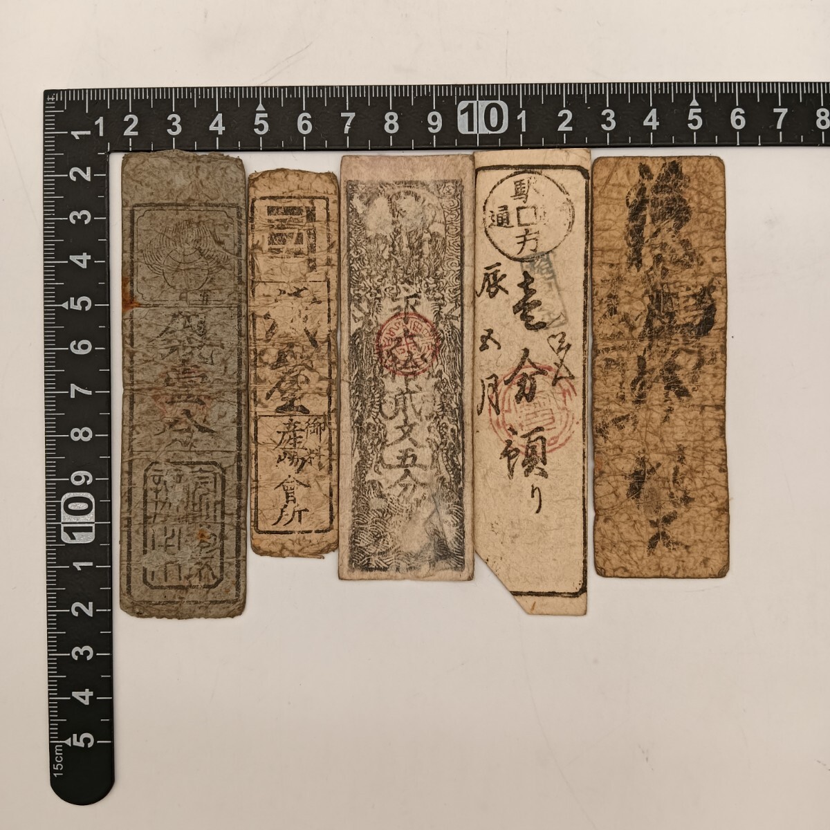 - 【A3537】江戸〜明治時代 古札 藩札 私札 朱印 貨幣 古紙幣 古文書 骨董品 アンティーク 5枚まとめ