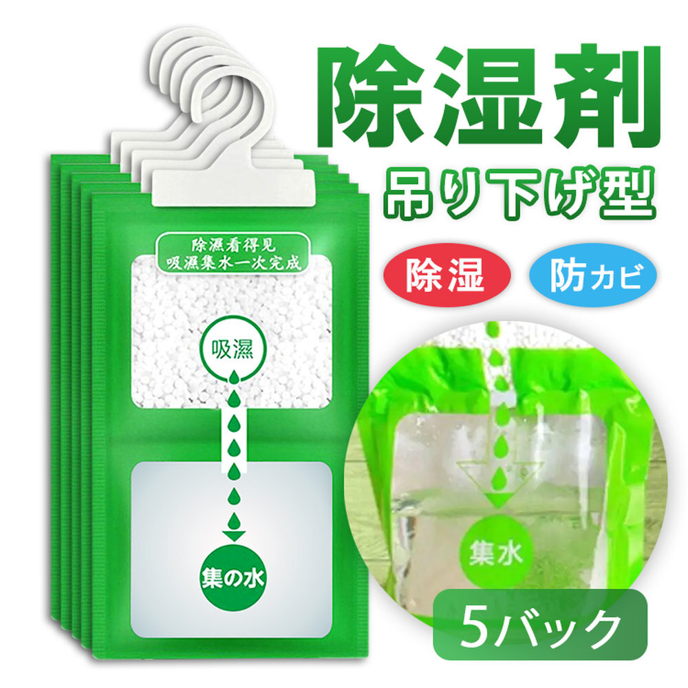 - 吊り下げ型除湿剤5パックセット掛けるだけ 設置簡単 湿気を吸い取り 除湿量約500ml 乾燥 除湿 防カビ GWCSGR05S