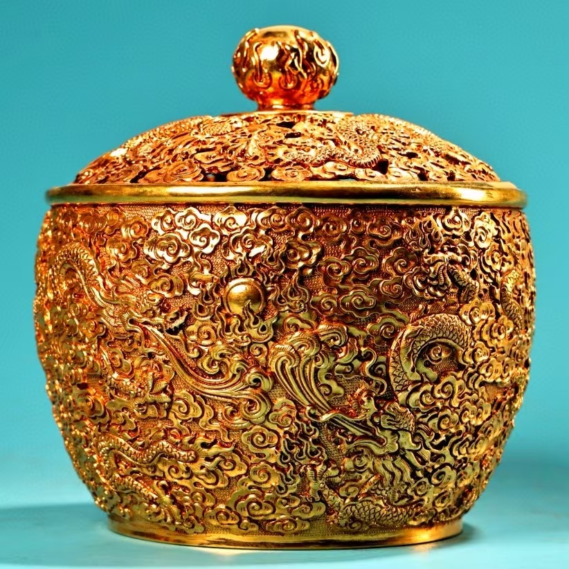 > 清代 乾隆年制 旧蔵 チベット古寺 古銅高レリーフ刻金盤龍宝缶 銅製 銅琉金 唐物 收蔵品 時代物 古美術 古置物 供養品 文房具 仏教6.26