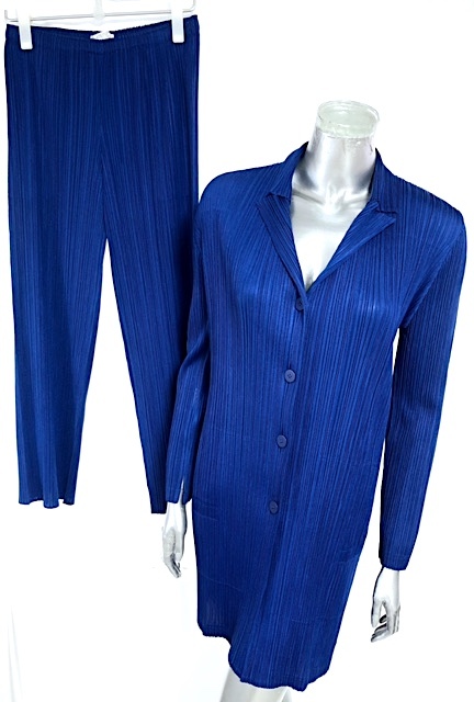 > ☆二点落札で送料無料!P6【ほぼ未使用】プリーツプリーズ セットアップ ロングジャケット/パンツ ブルー S-M フォーマル イッセイミヤケ