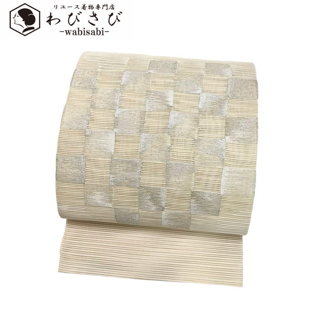> 夏帯 名古屋帯 絽綴れ 四角模様 銀糸 生成り色 O-3973 着物 きもの kimono 和服 和装 中古 リサイクル着物 【送料無料】
