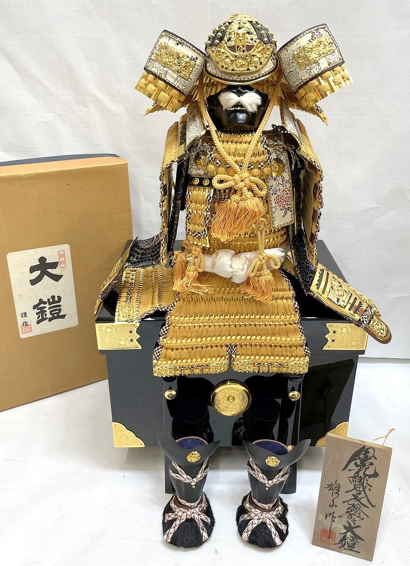 - 購入60万円!新品同様 五月人形 雄山作 大鎧 黒小札緋威 ゴールド 金 端午の節句 甲冑 鎧兜 櫃付 武将 置物 工芸品 骨董 作家物 B