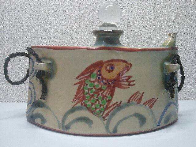 > ☆r☆【美術工芸・インテリア】琉球 沖縄仁王窯 壺屋焼 仁銘 魚紋 抱瓶 陶磁器 /酒器 やむちん 飾り置き