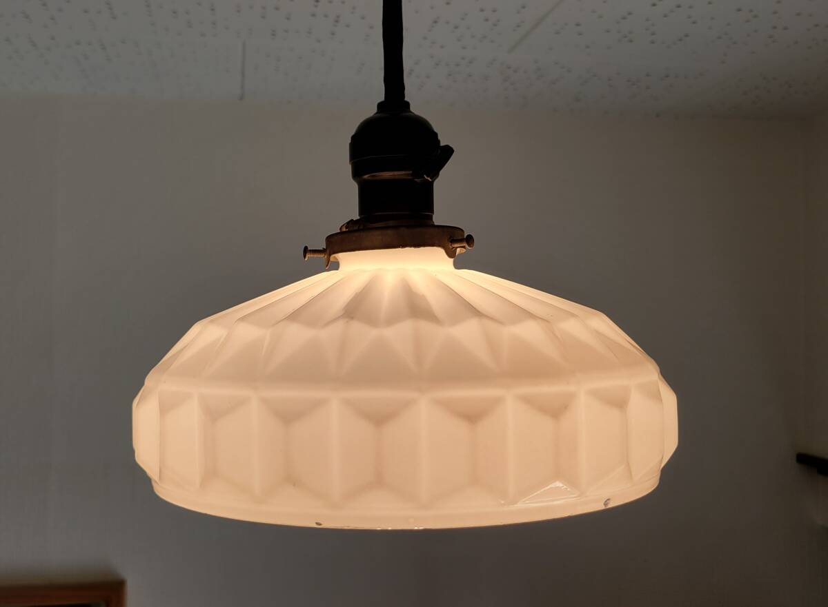 - 古電灯電傘 電笠 ダイヤ柄 シェード 被せ乳白色 プレスガラス 照明 和風 和室 和照明 古民家 リノベ 昭和レトロ