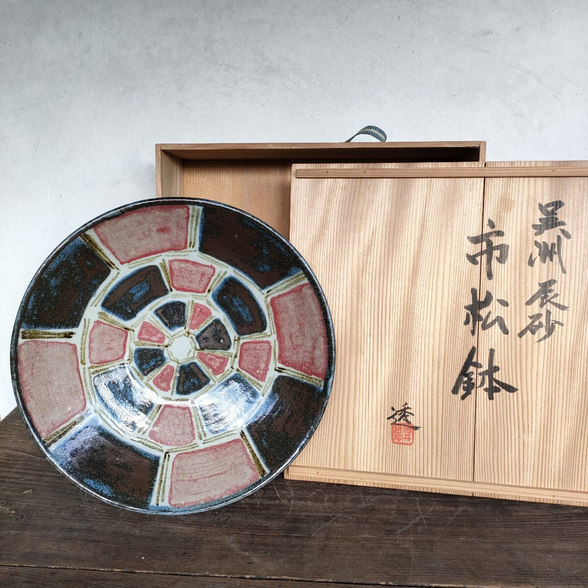 > 河井透(造) 呉洲辰砂市松鉢 約40.5cm-41cm 共箱あり共箱の蓋に隙間あり 大鉢大皿 師は河井寛次郎 民藝民芸現代工芸美術品