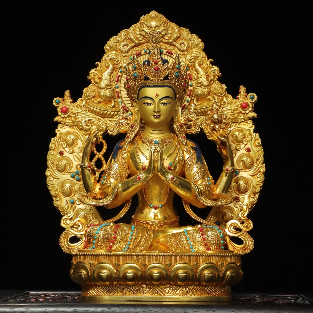 > 早期收集 古銅塗金 描彩 宗教 佛像 仏像 四臂観音仏 造像 居家供奉置物 擺件 時代物 古董品 骨董 旧家蔵出 唐物 中国古玩 古美術