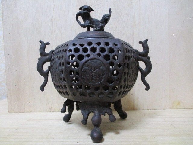- A216-354W 置物 香炉 三葉葵紋 徳川紋 葵紋 双耳 中古 高さ約17.7cm (洋押左)