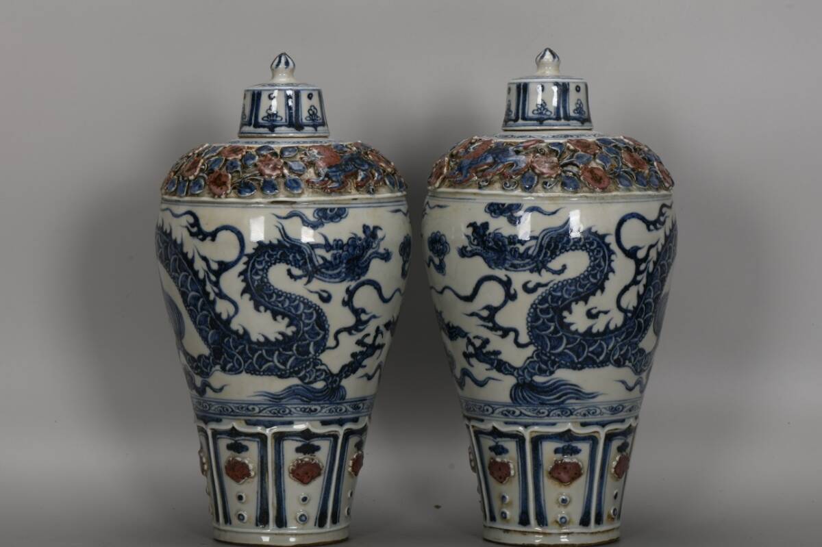 - 7_ZZ4281 【惠】人間国宝 中国骨董 陶芸 磁器【元青花つま花模様龍梅瓶一対です】工芸品 施釉陶 青花磁 陶芸 置物 收藏品