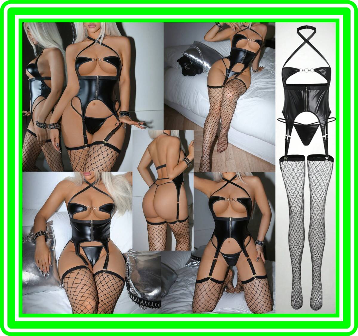 - ★超素敵★フェイクレザー★ガーターランジェリーセット★フロントジッパー★バスト部デザイン超キュート★Tバック★A163