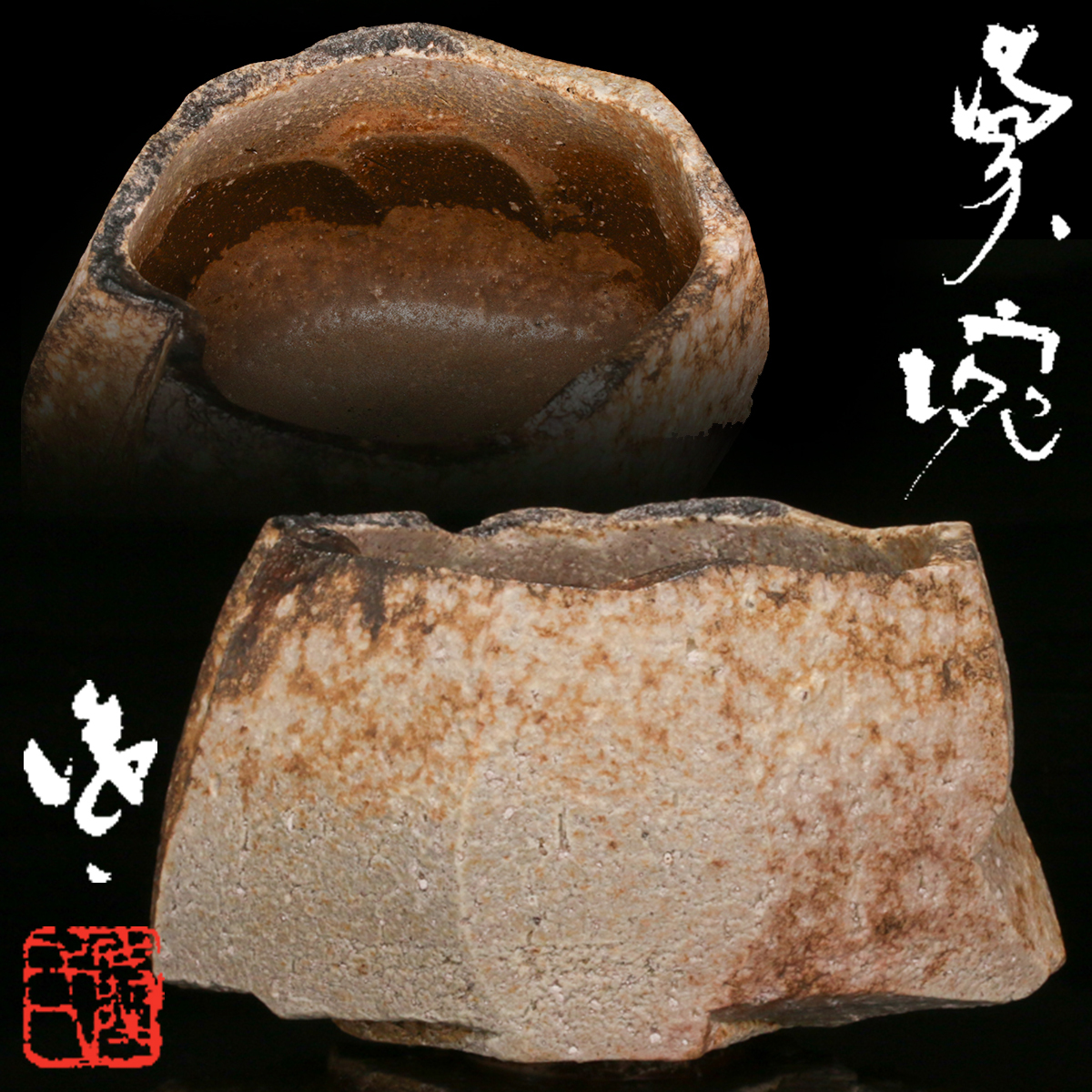 > 隠崎隆一『備前茶碗』秀逸作 共箱 共布 栞 本物保証 送料無料 新品同様【松森美術】