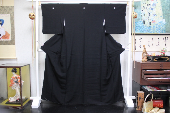 > きもの今昔8720 黒の礼装 袷喪服きもの 正絹高級一越ちりめん地 室系と付き未使用品 家紋「細輪に桔梗」身丈162cm