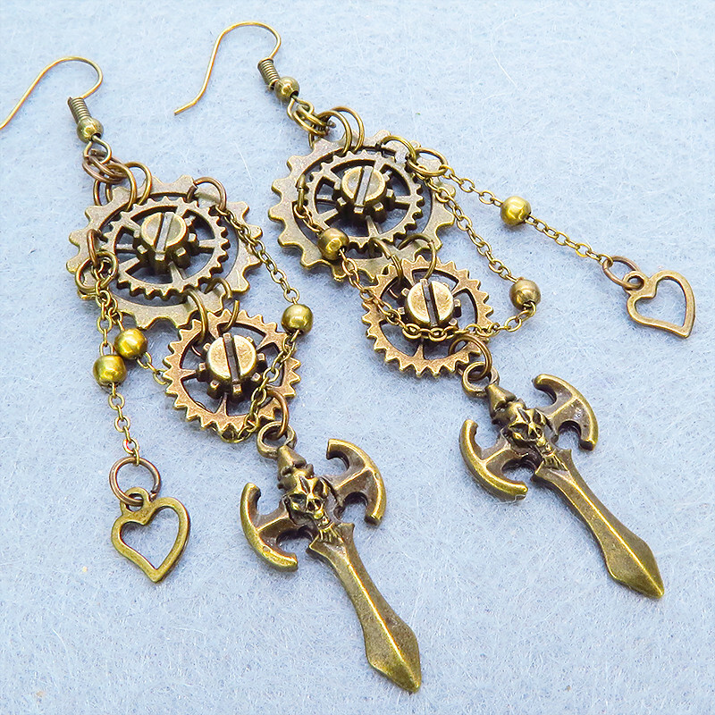- アンティークゴールド ゴシック調ソードと歯車を組合せたスチームパンク風チェーンピアス