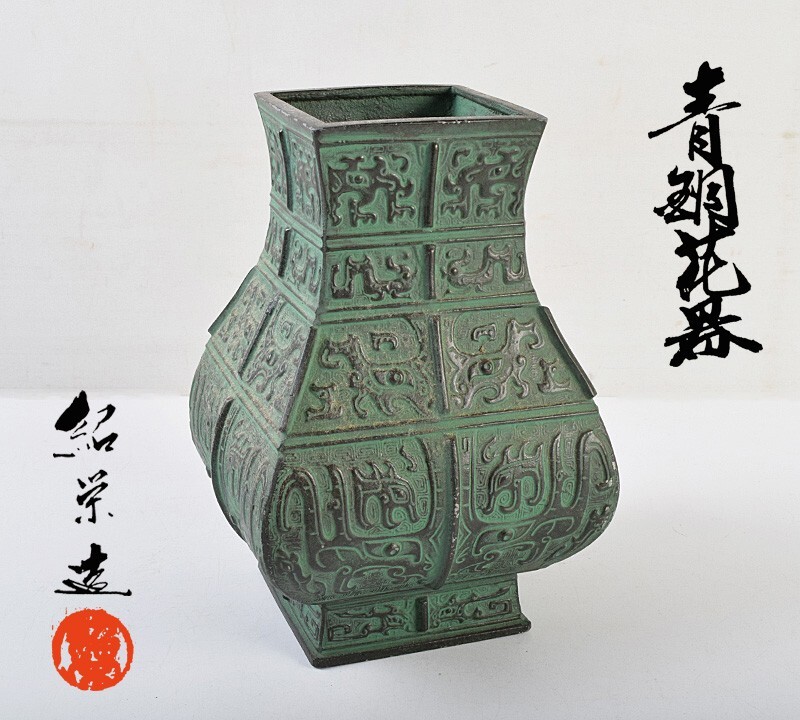 - 茶道具 金森紹栄造 青銅 饕餮文 四方花器 共箱 CHZT