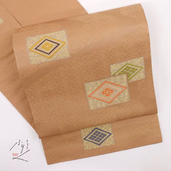 - 【名古屋帯】 重ね花菱模様 焦香色 小紋や色無地に 正絹着物 NY3-6