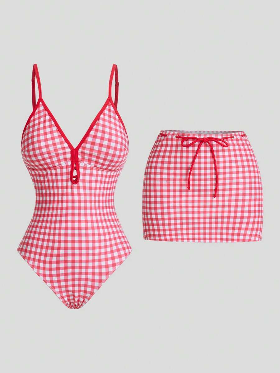 - レディース 水着 ワンピース ヴィンテージスタイル チェック柄ワンピース水着 スカート付き ウィメンズ、夏休み用モノキニ、ビーチ向