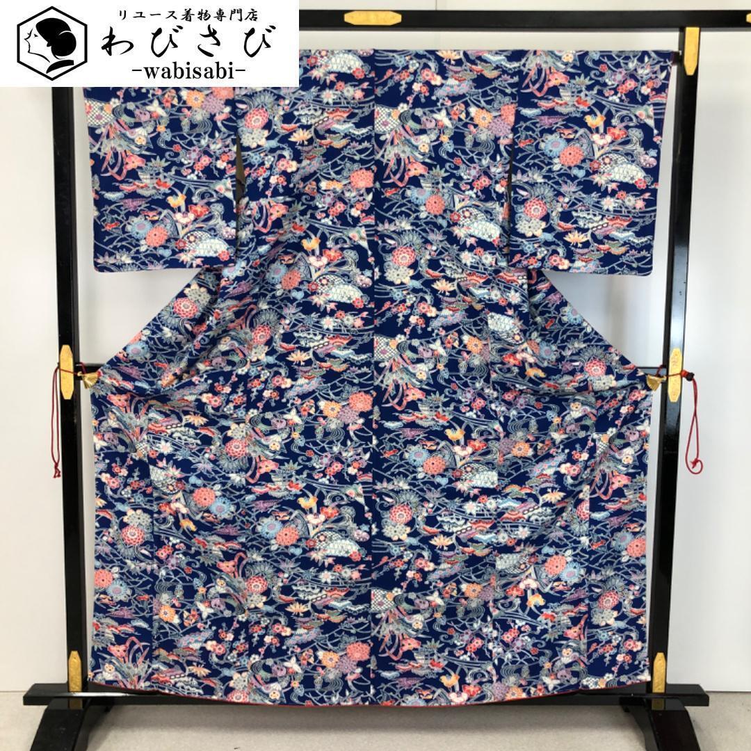- 小紋 型染 扇子に花模様 鳥 青色 縮緬 しつけ糸 K-5000 着物 きもの kimono 和服 和装 中古 リサイクル着物 【送料無料】