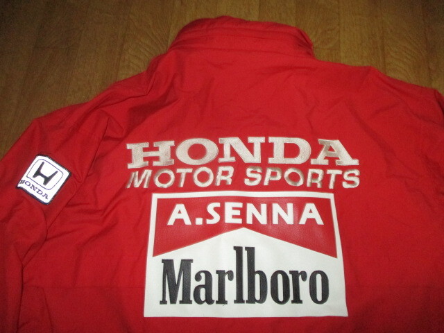 - ホンダF1コレクション・マクラーレン・アイルトンセナ ビンテージ プラチナ色刺繍ロゴ・レザー系パッチ ジャケット サイズL(LL相当)